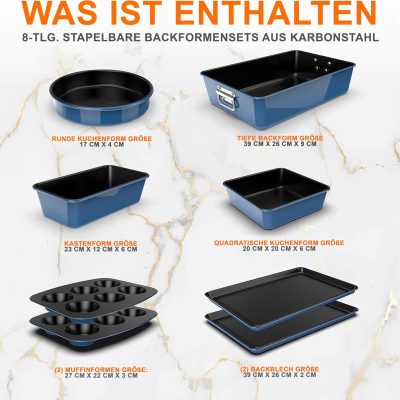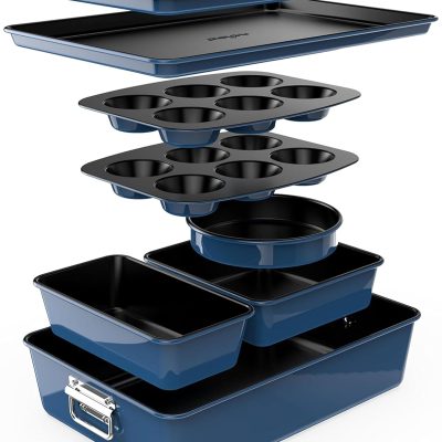 NutriChef 8-Piece Nonstick Stackable Bakeware Set – PFOA, PFOS, PTFE Free Baking Tray Set w/Non-Stick Coating, 450°F Oven Safe, Round Cake, Loaf, Muffin, Wide/Square Pans, Cookie Sheet (Blue)