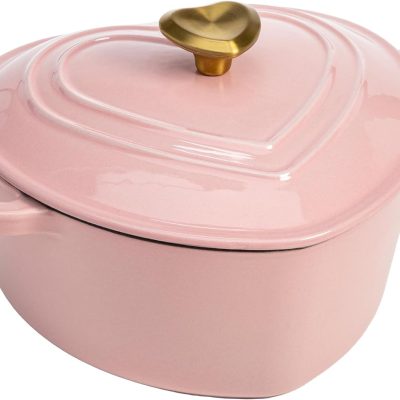 Paris Hilton Enameled Cast Iron Dutch Oven Heart-Shaped Pot with Lid, Dual Handles, Works on All Stovetops, Oven Safe to 500°F, 2-Quart, Pink
