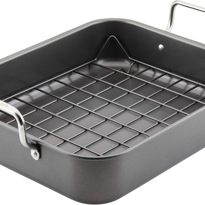 Rachael Ray Bakeware Nonstick Roaster/Roasting Pan with Reversible Rack, 16.5 Inch x 13.5 Inch, Gray