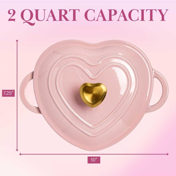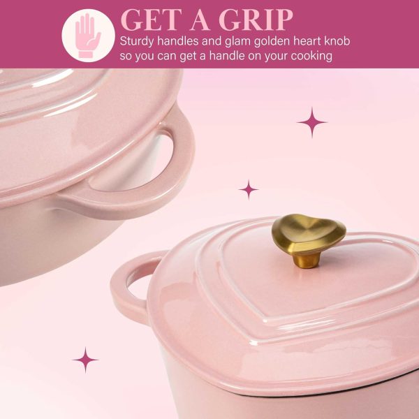 Paris Hilton Enameled Cast Iron Dutch Oven Heart-Shaped Pot with Lid, Dual Handles, Works on All Stovetops, Oven Safe to 500°F, 2-Quart, Pink